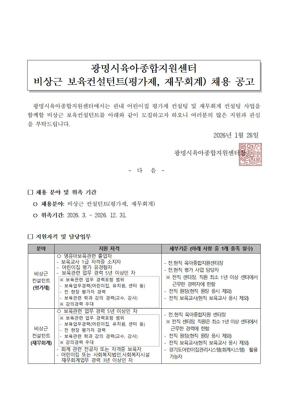[채용] 광명시육아종합지원센터 비상근 보육컨설턴트(평가제, 재무회계) 채용 공고