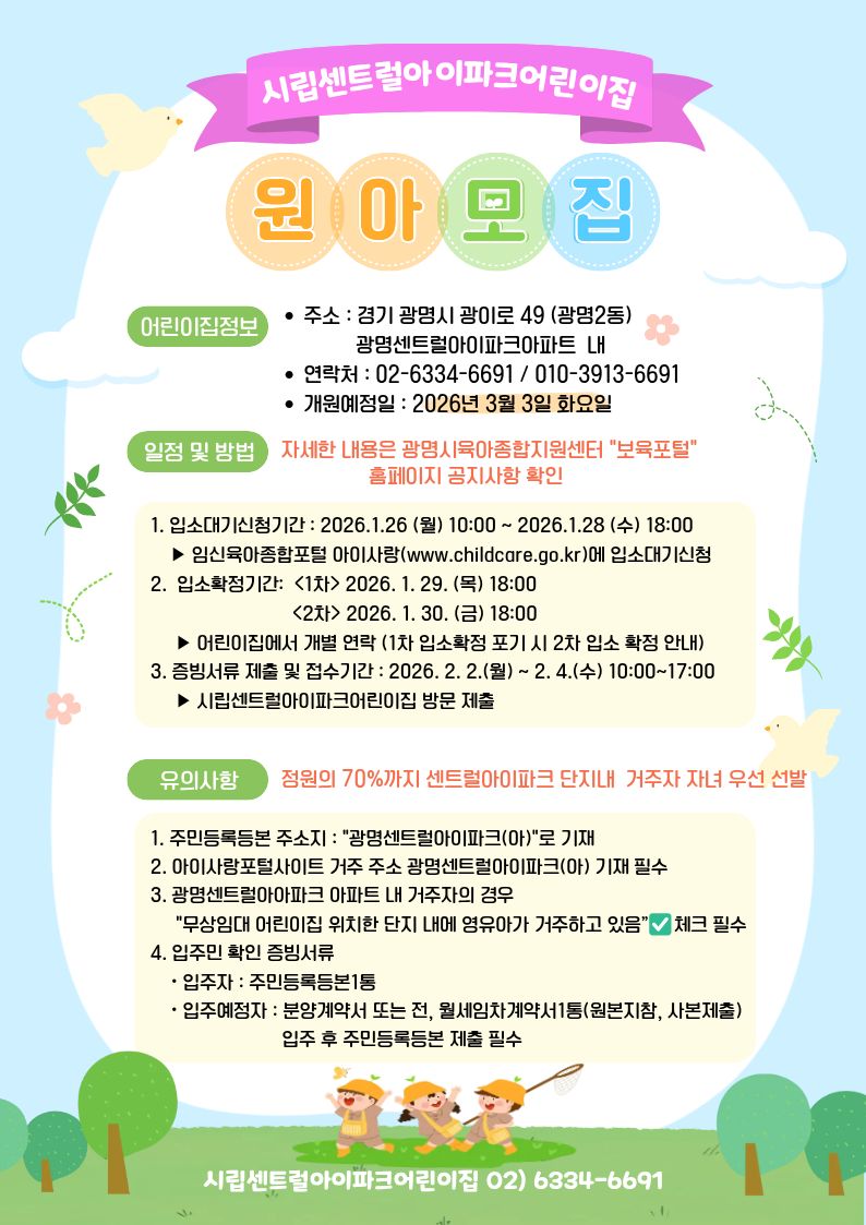 [안내] 시립센트럴아이파크어린이집 원아모집 안내