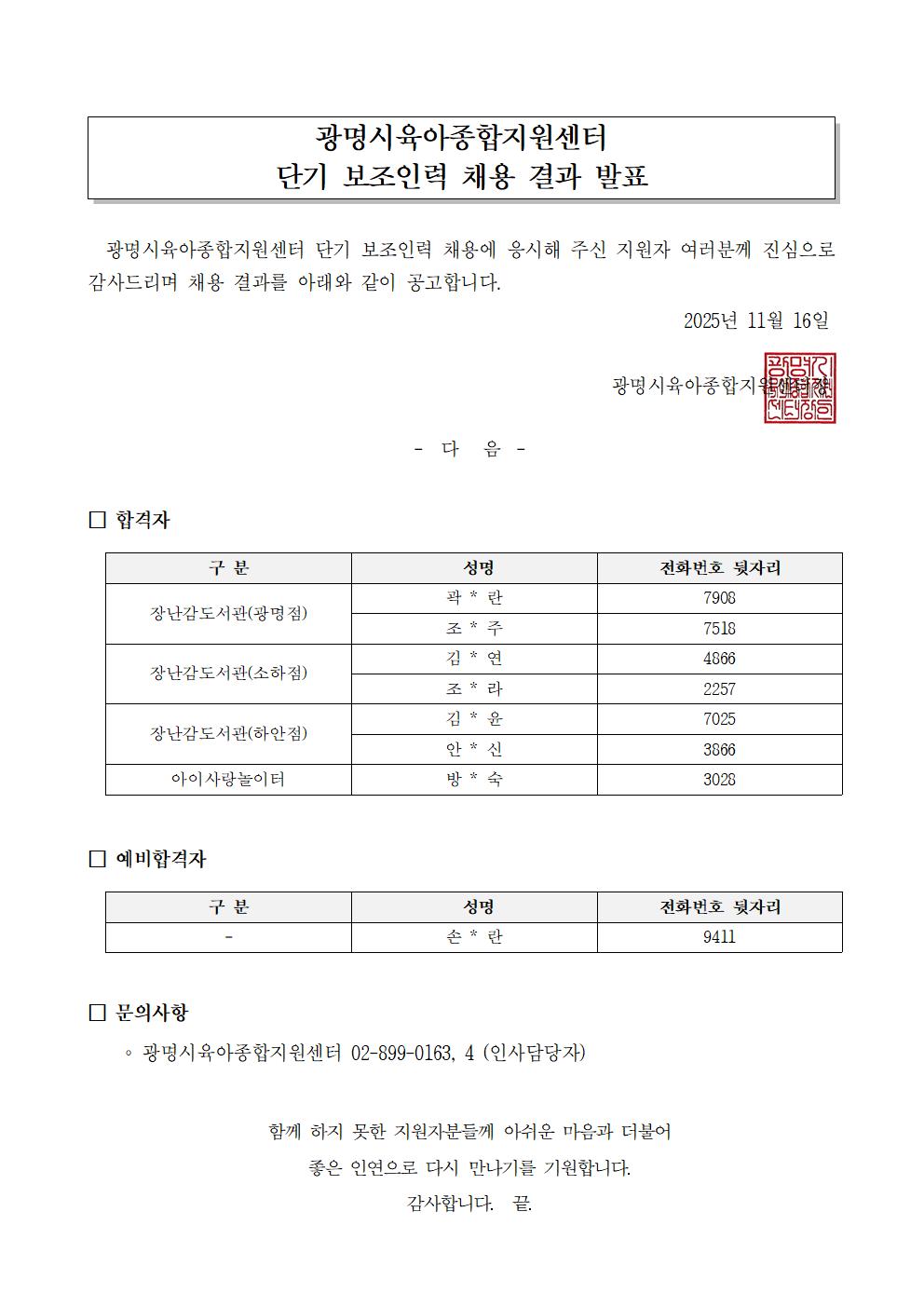 [안내] 광명시육아종합지원센터 단기보조인력 채용 결과 공고