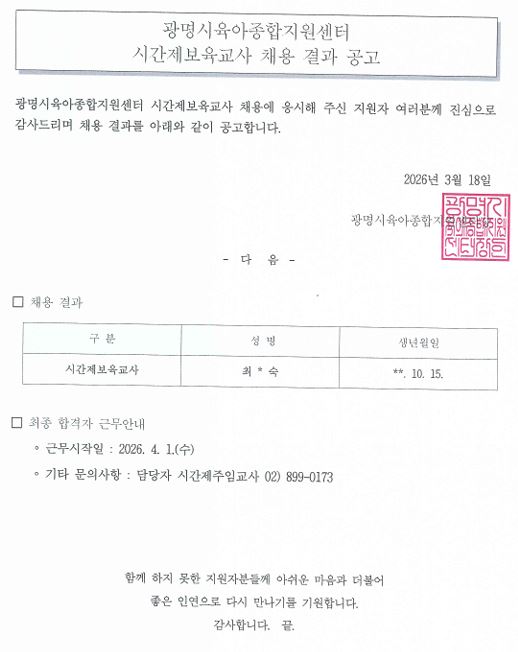 [채용] 광명시육아종합지원센터 시간제보육교사 채용 결과 공고
