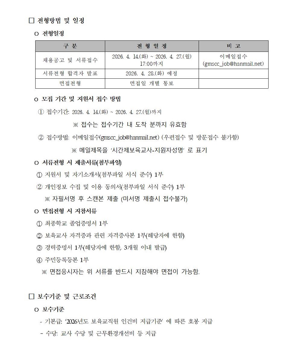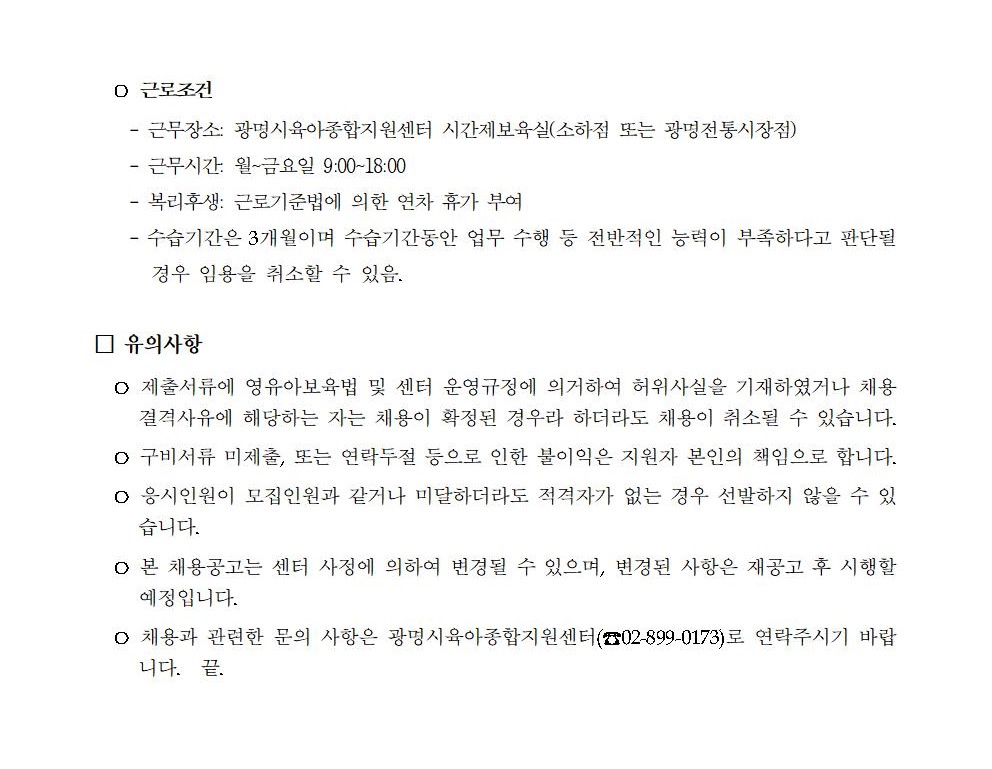 [채용] 광명시육아종합지원센터 시간제보육교사 공개 채용 공고