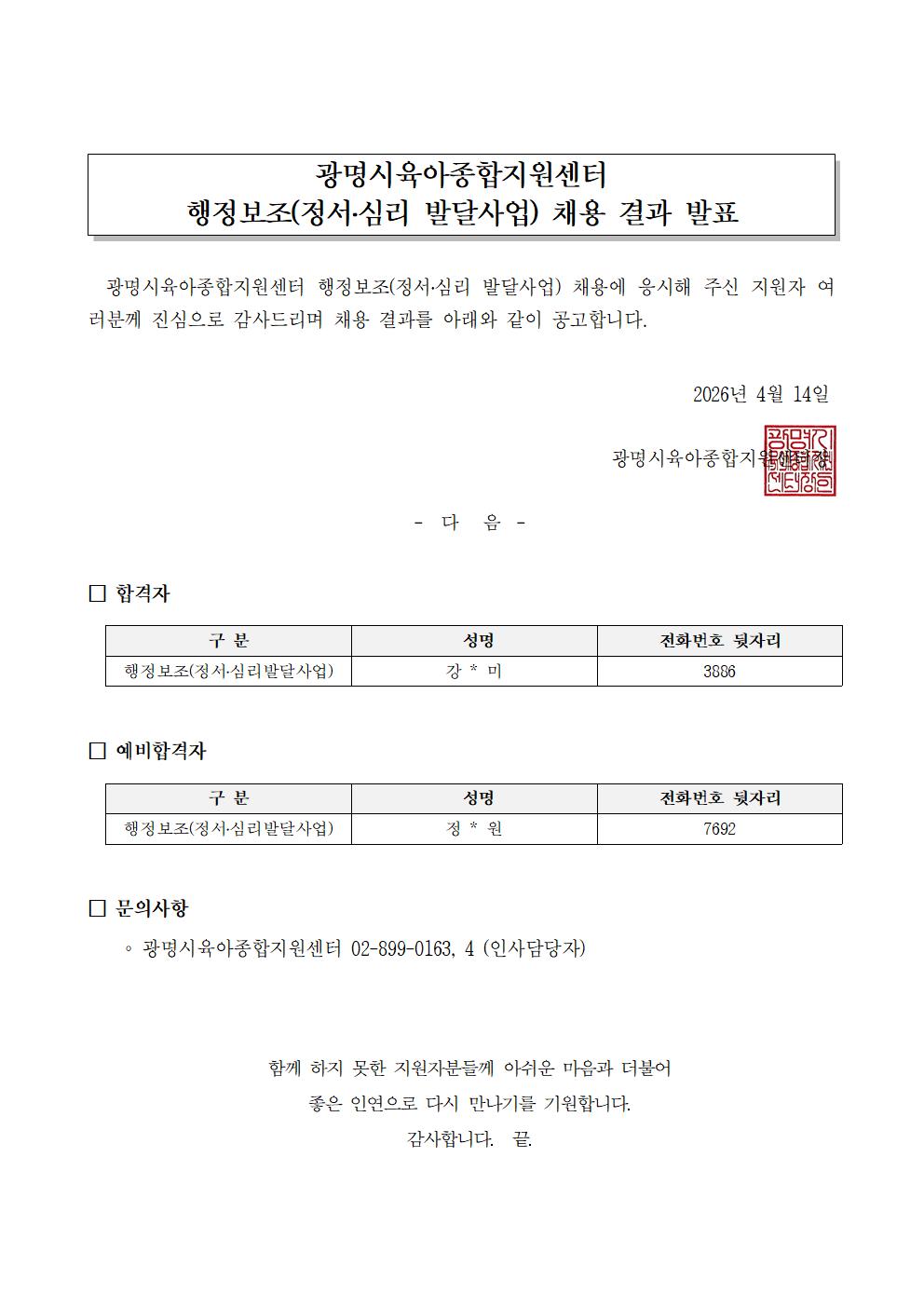 [채용] 광명시육아종합지원센터 정서 심리 발달사업 행정보조인력 결과안내