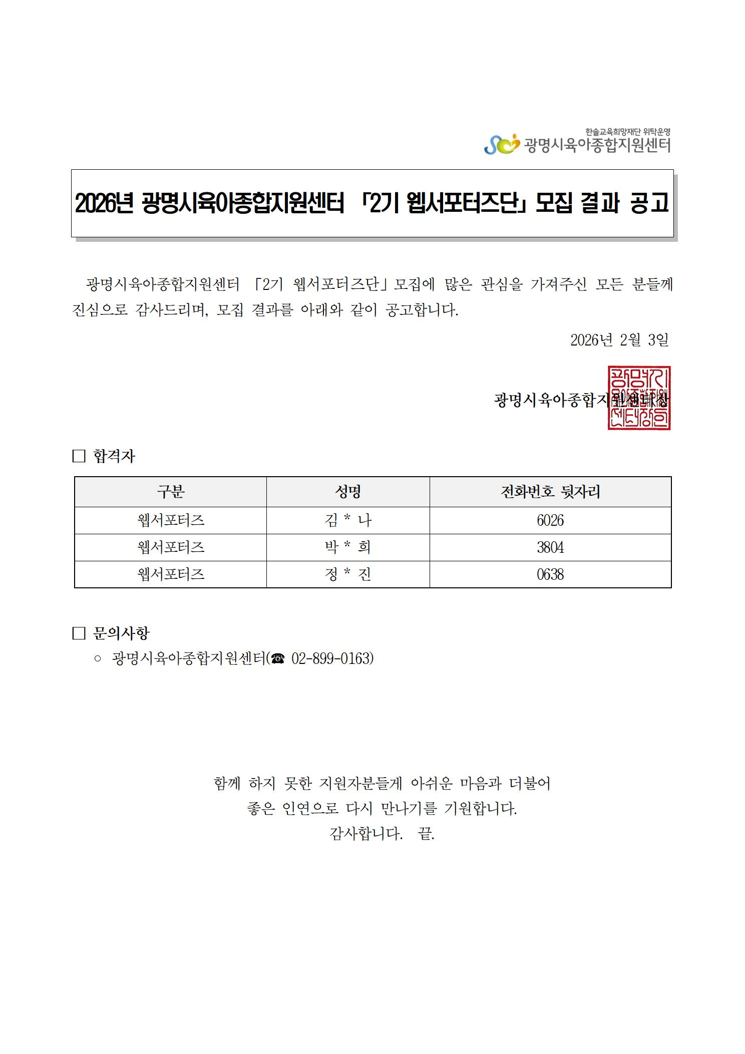 [공고] [광명시육아종합지원센터] 2기 웹서포터즈단 모집 결과 공고