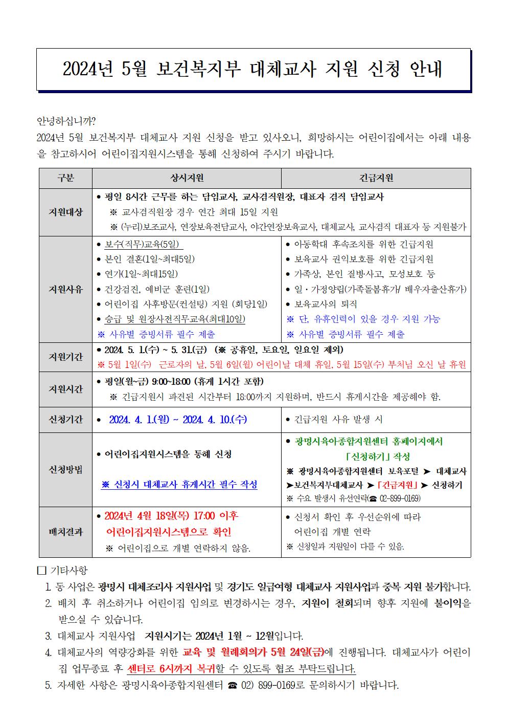 [휴가신청] 2024년 5월 보건복지부대체교사 휴가신청 안내