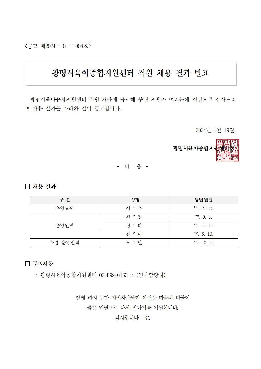 [채용] 광명시육아종합지원센터 직원 채용 결과 발표