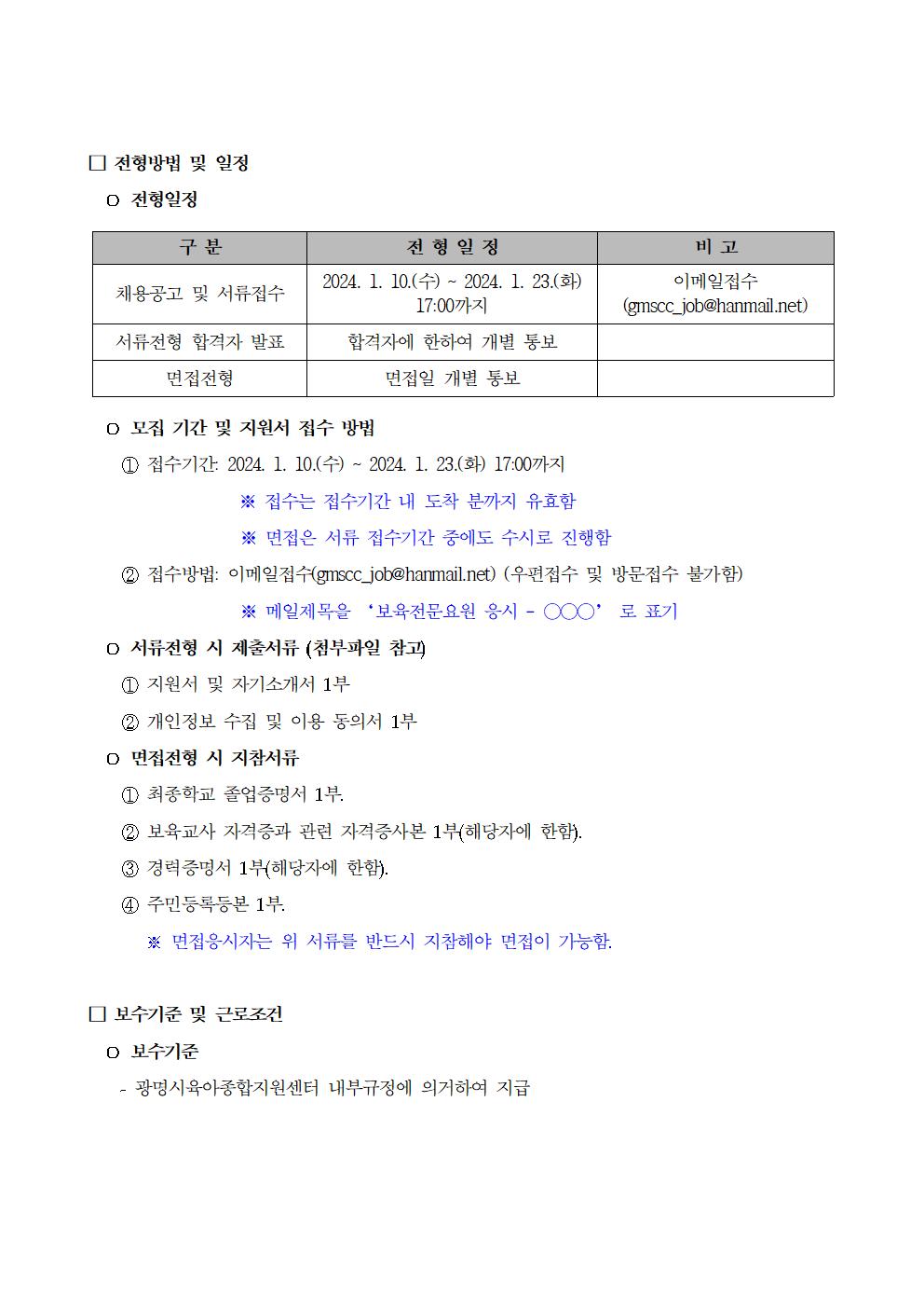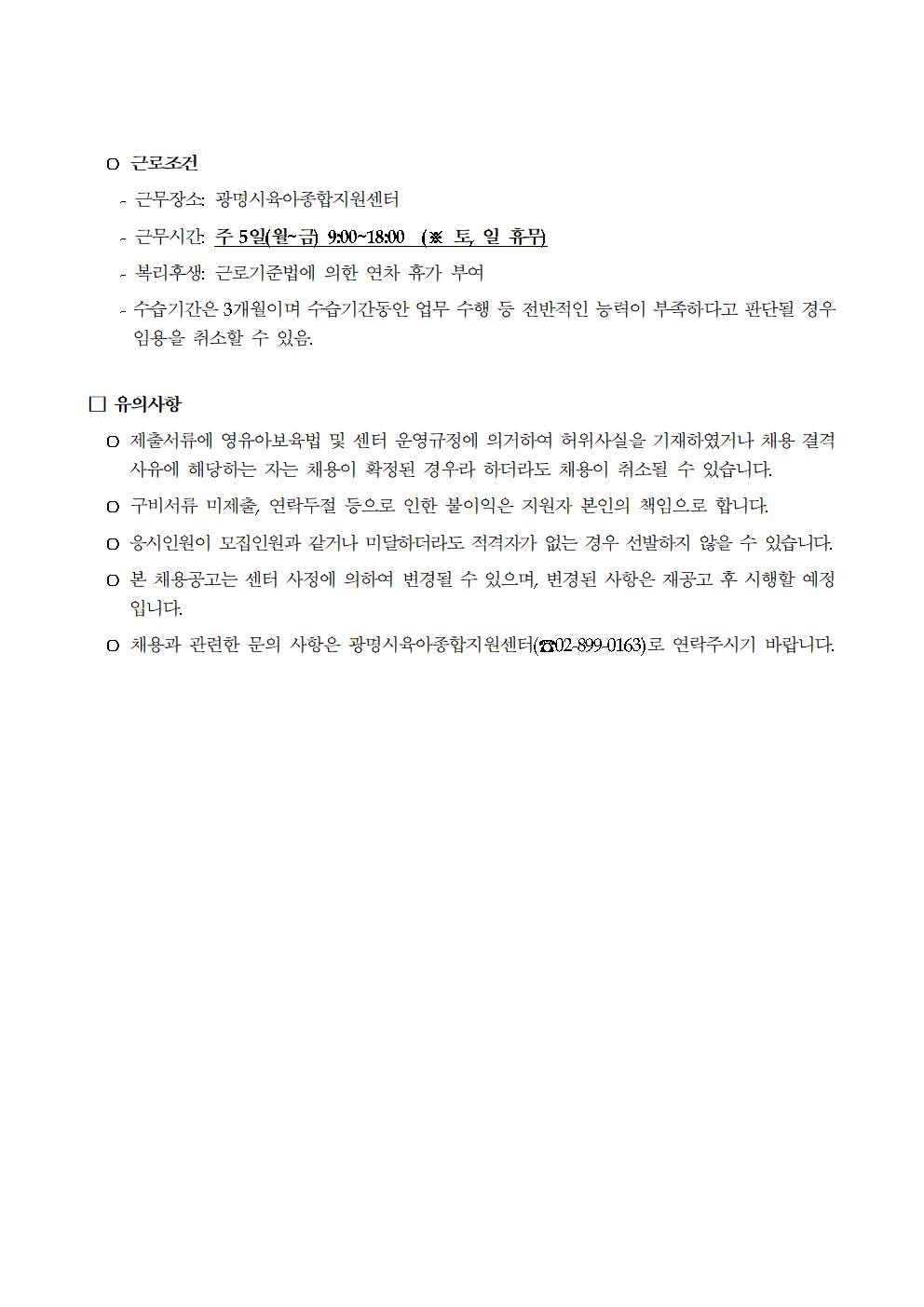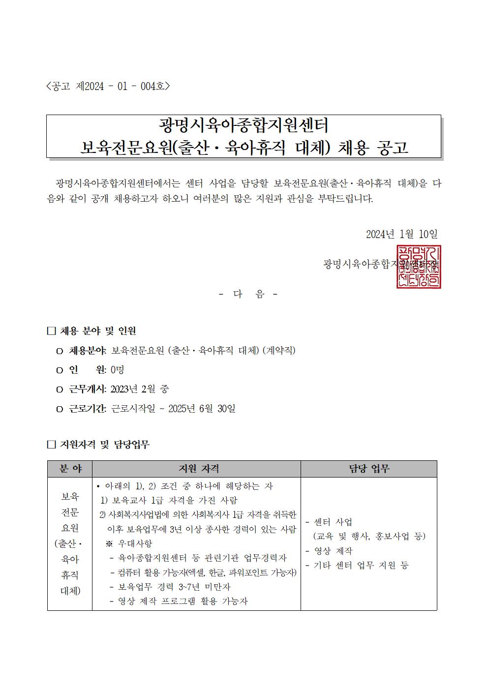 [채용] 광명시육아종합지원센터 보육전문요원(출산·육아휴직 대체) 채용 공고