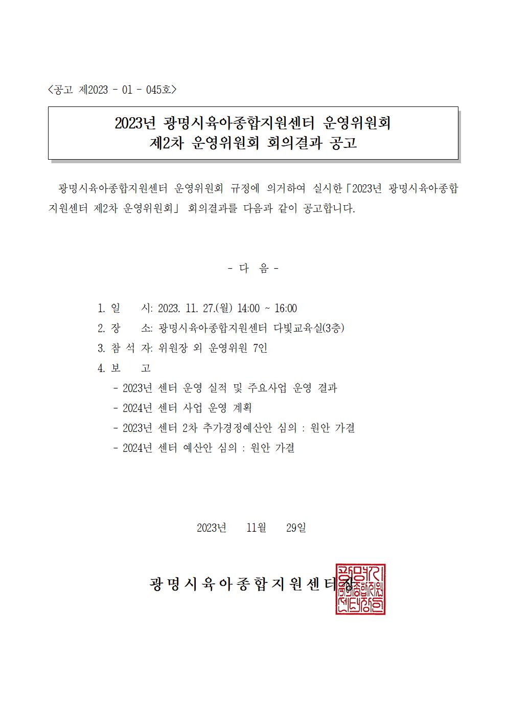 [안내] 2023년 광명시육아종합지원센터 운영위원회 제2차 운영위원회 회의결과 공고