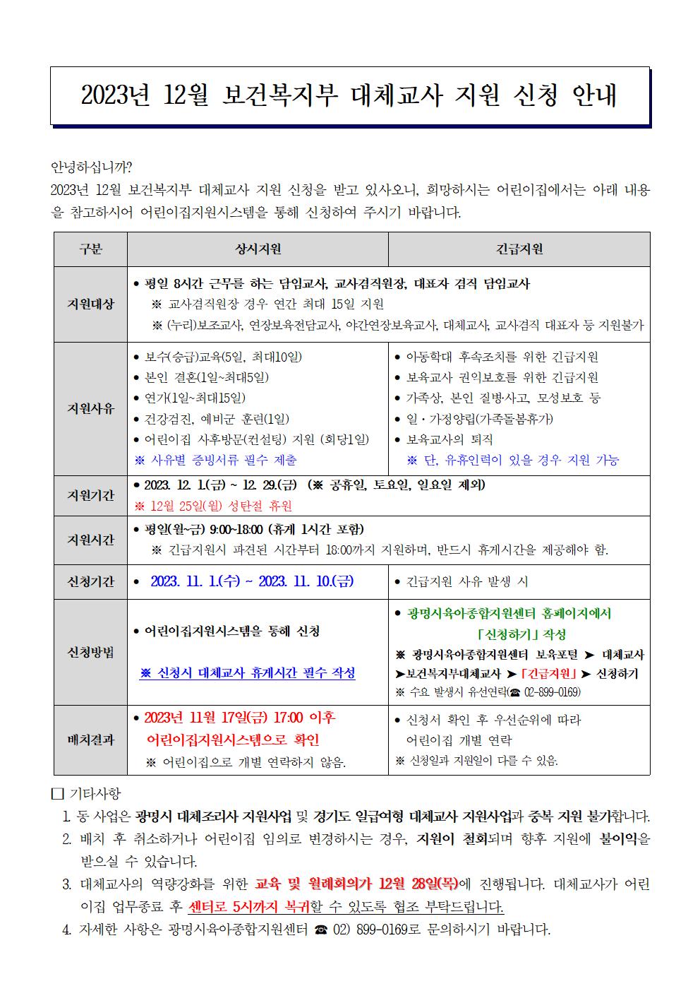 [휴가신청] 2023년 보건보지부 대체교사 12월 휴가신청 안내