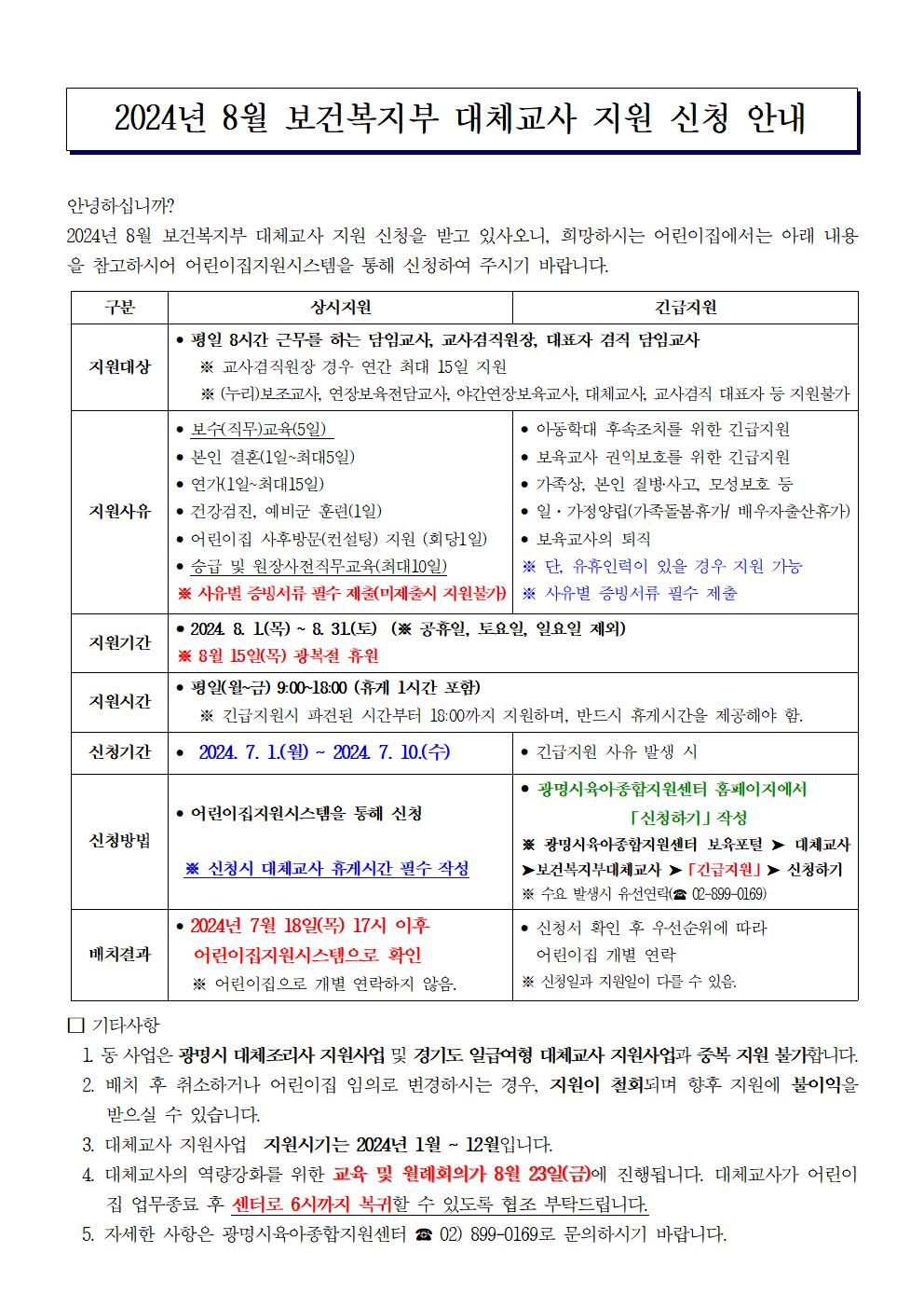 [휴가신청] 2024년 8월 보건복지부대체교사 휴가신청 안내