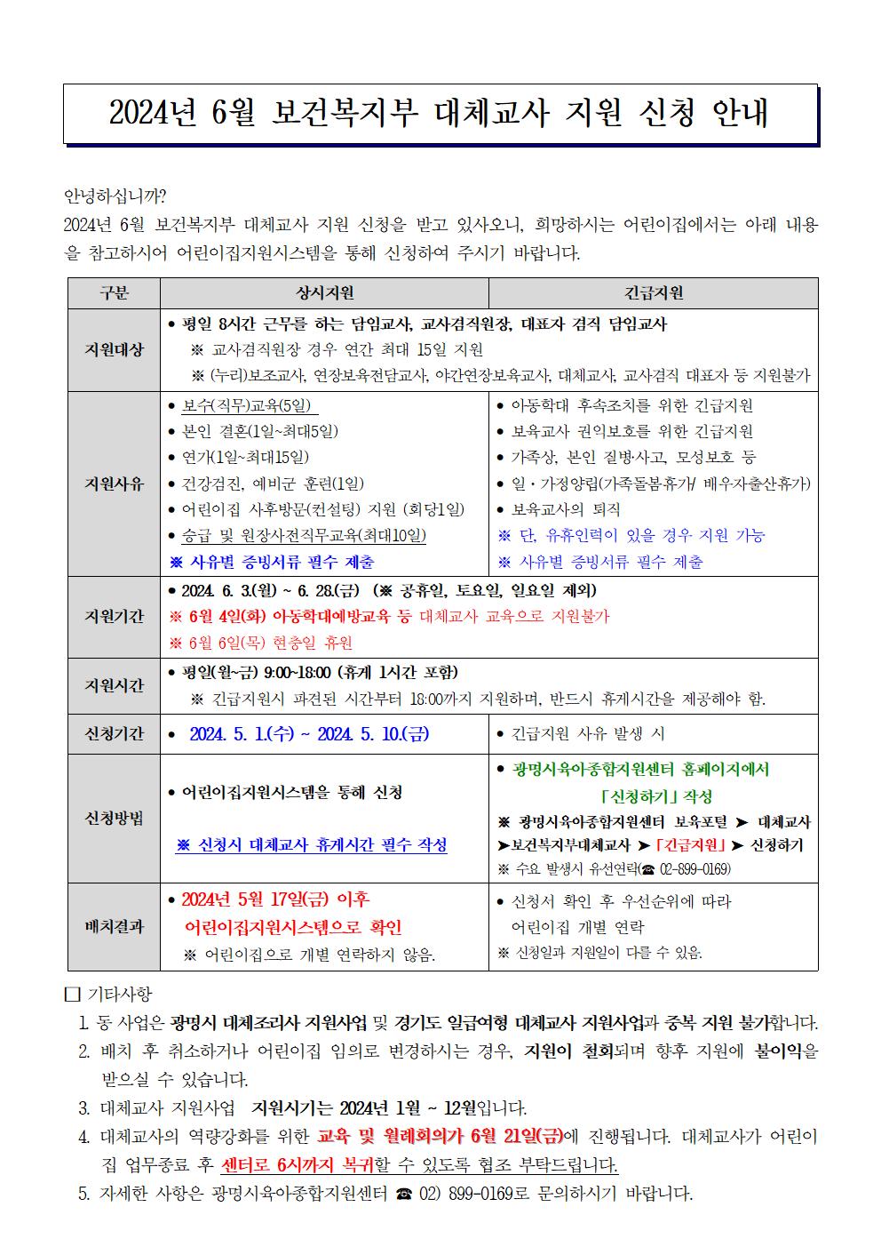 [휴가신청] 2024년 6월 보건복지부대체교사 휴가신청 안내
