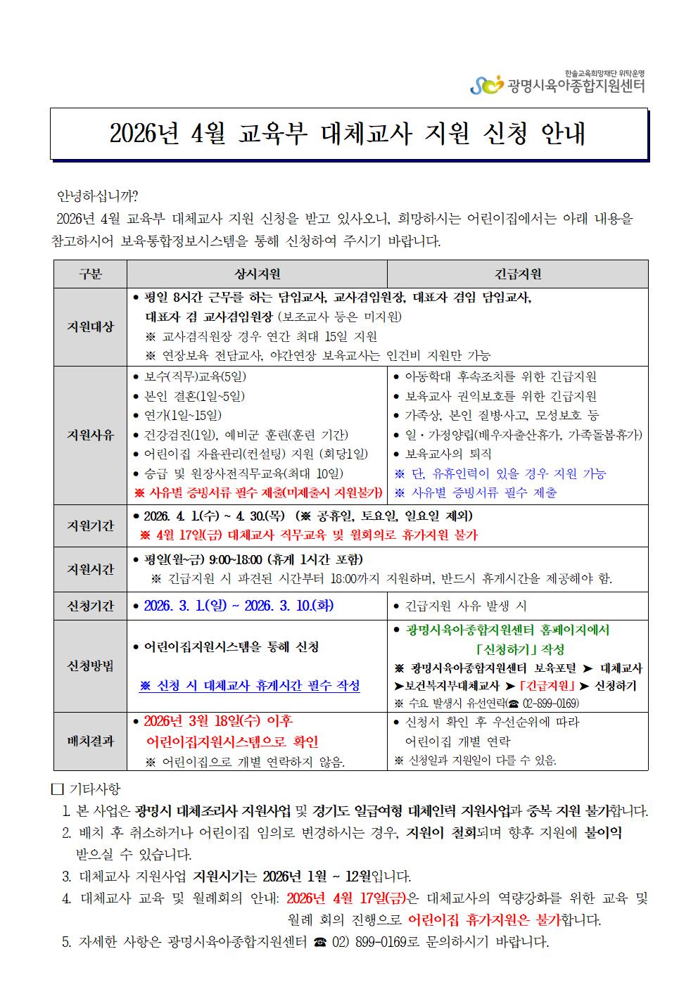 [휴가신청] 2026년 4월 교육부대체교사 지원신청 안내