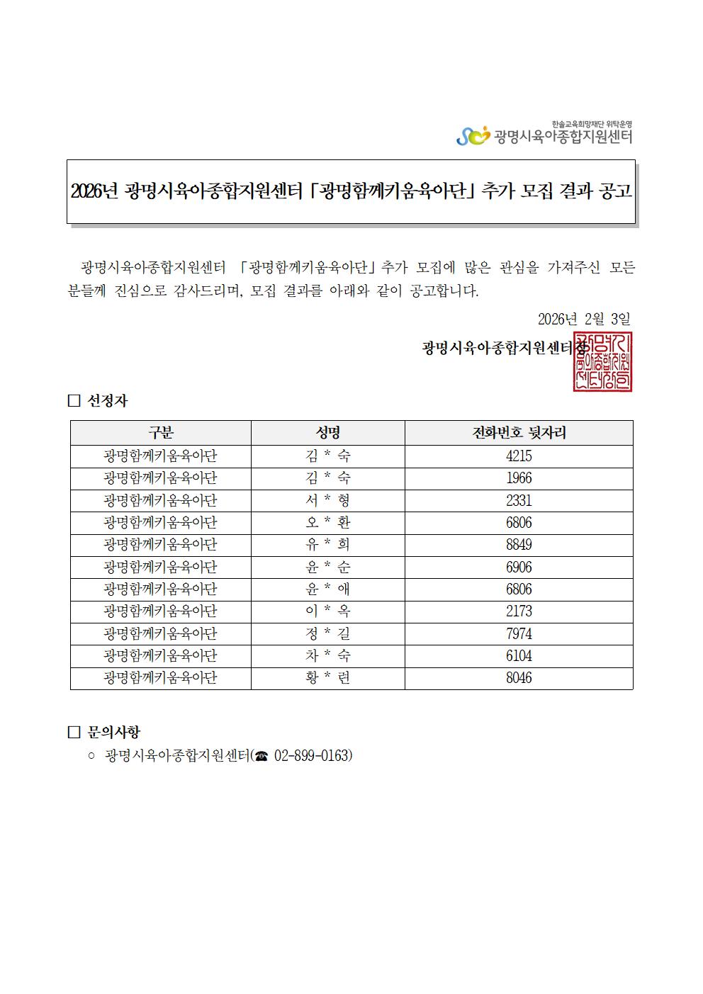 [공고] 2026년 광명시육아종합지원센터 「광명함께키움육아단」 추가모집 결과 공고