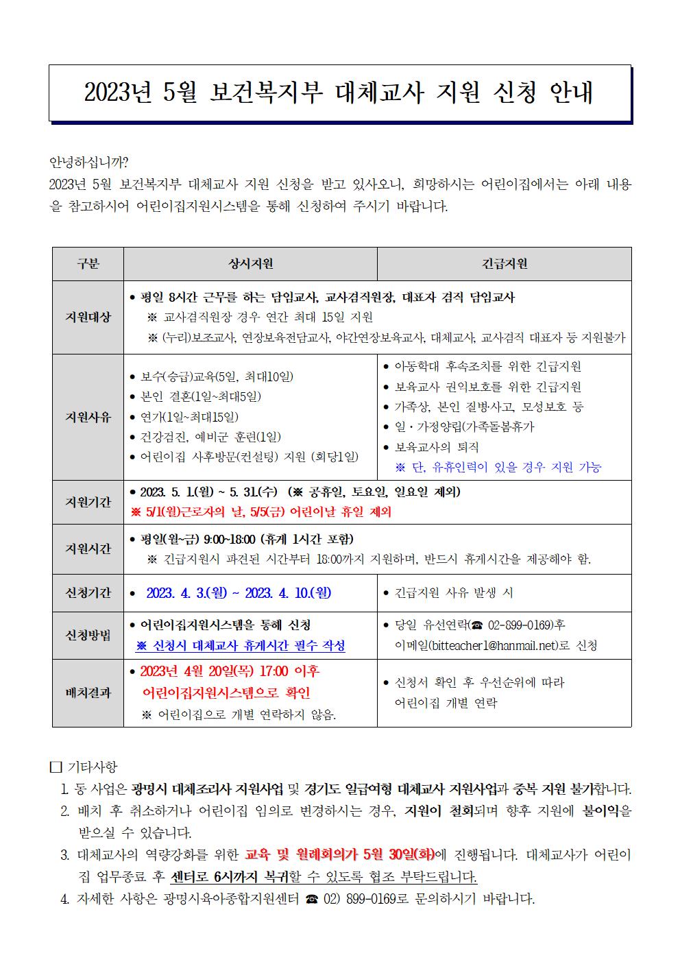 [휴가신청] 2023년 보건보지부 대체교사 5월 휴가신청 안내