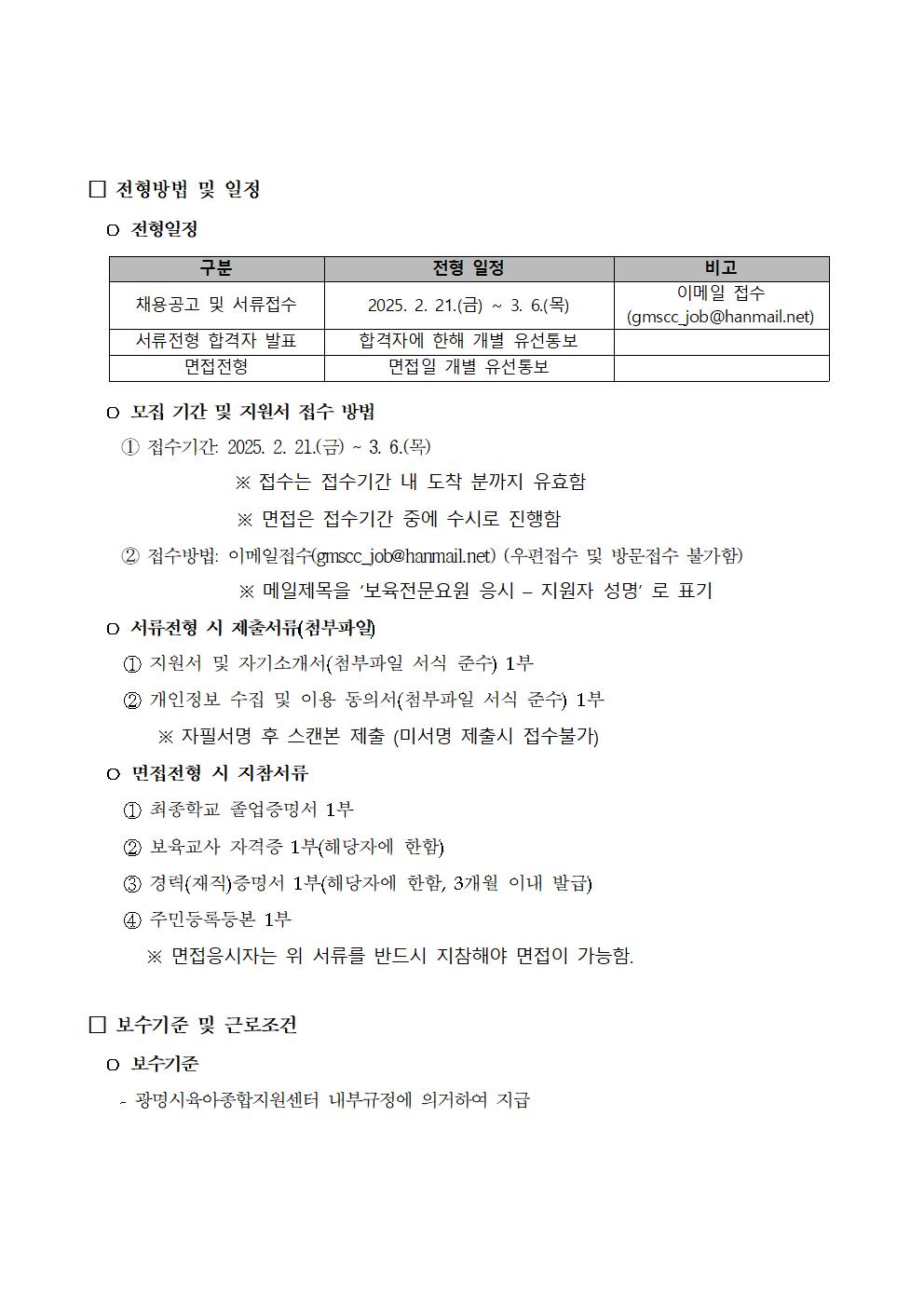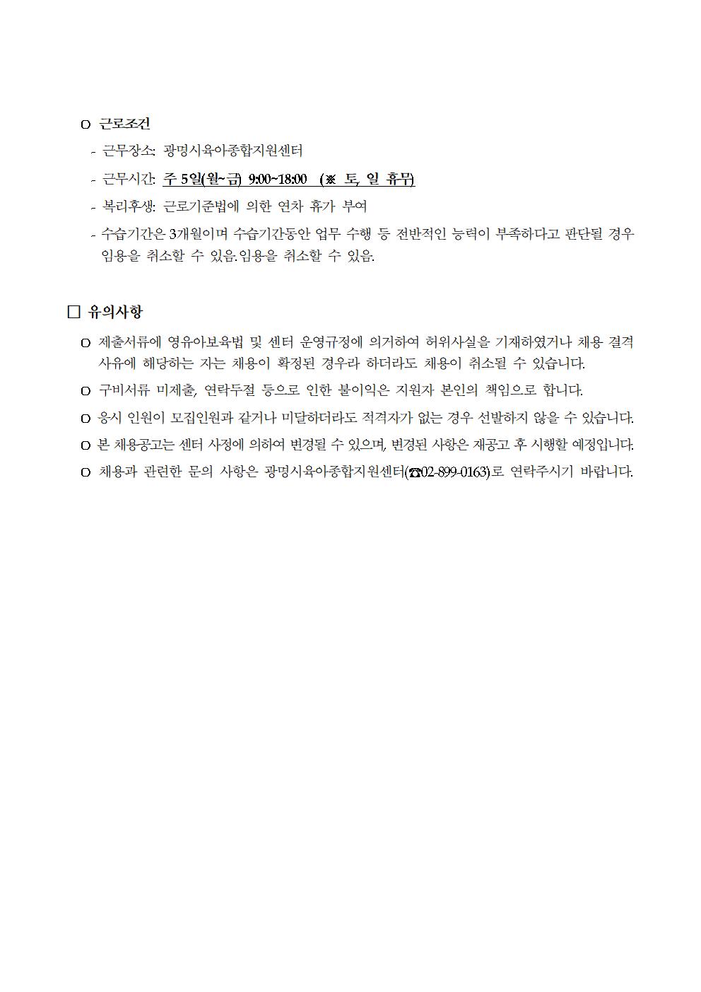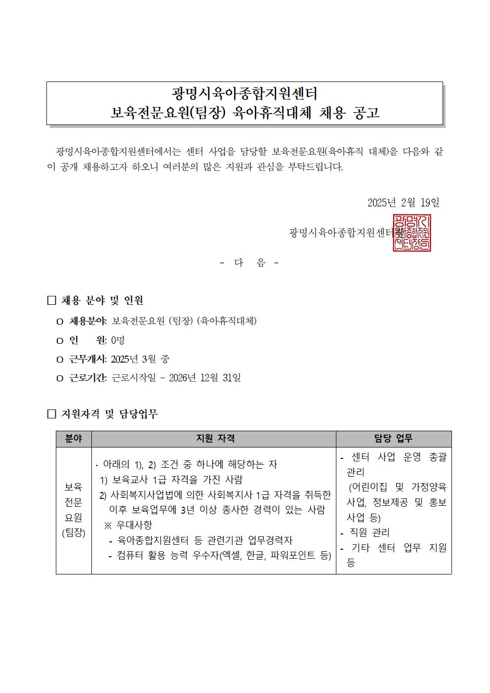 [채용] 광명시육아종합지원센터 보육전문요원(팀장) 육아휴직대체 채용 공고