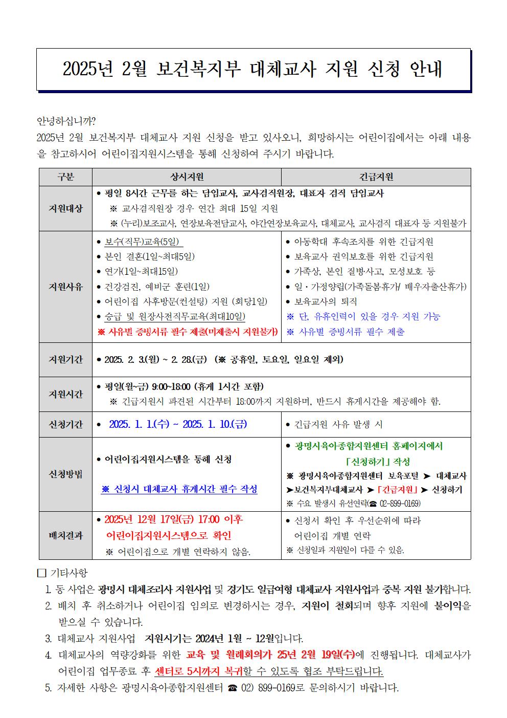 [휴가신청] 2025년 2월 보건복지부대체교사 휴가신청 안내