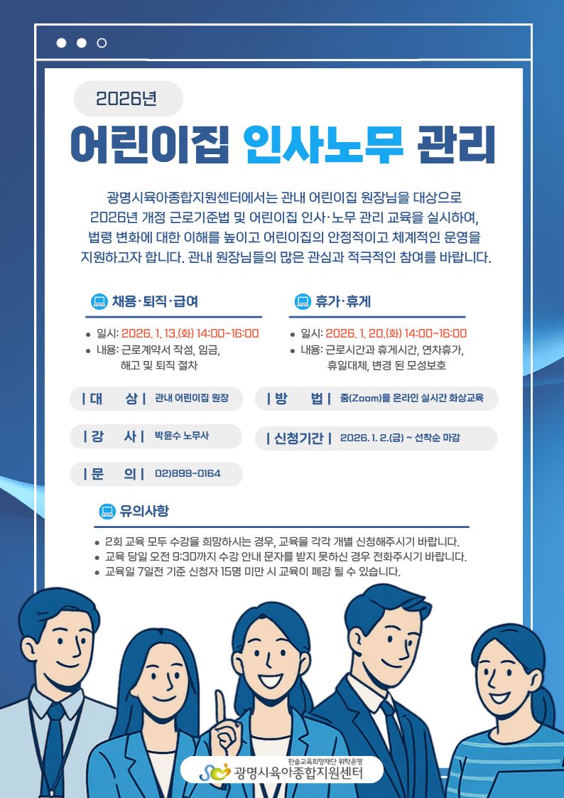 2026년 어린이집 인사노무관리(채용,퇴직,급여) 2026.01.13(화) 14:00 ~ 16:00