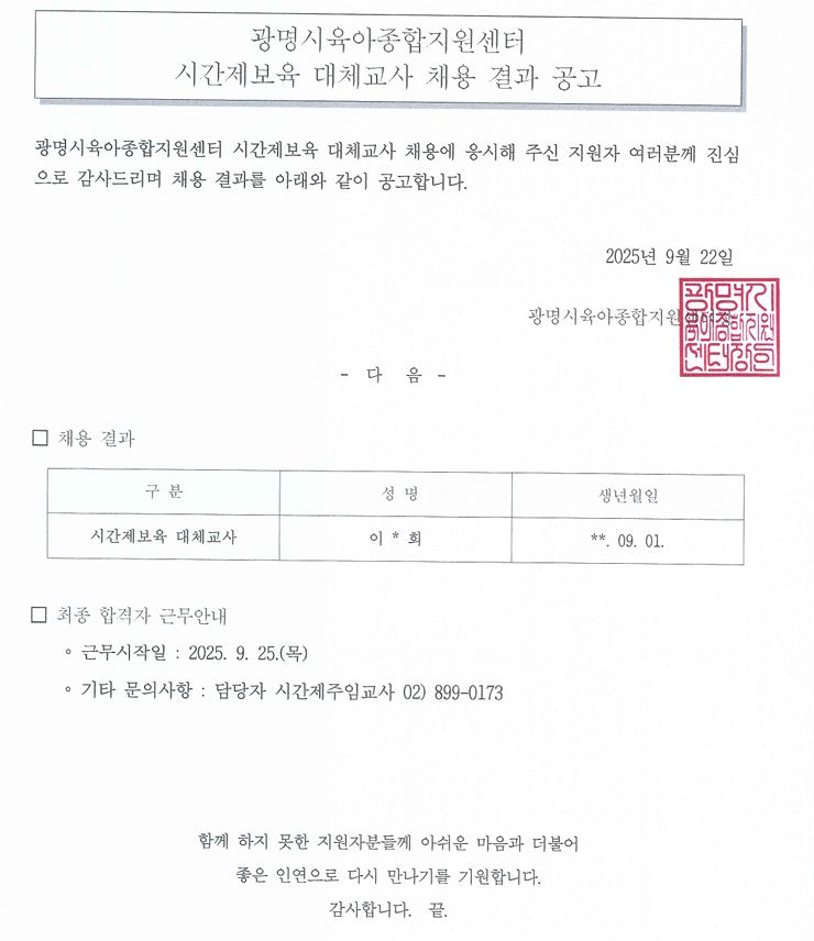[채용] 광명시육아종합지원센터 시간제보육 대체교사 채용 결과 공고
