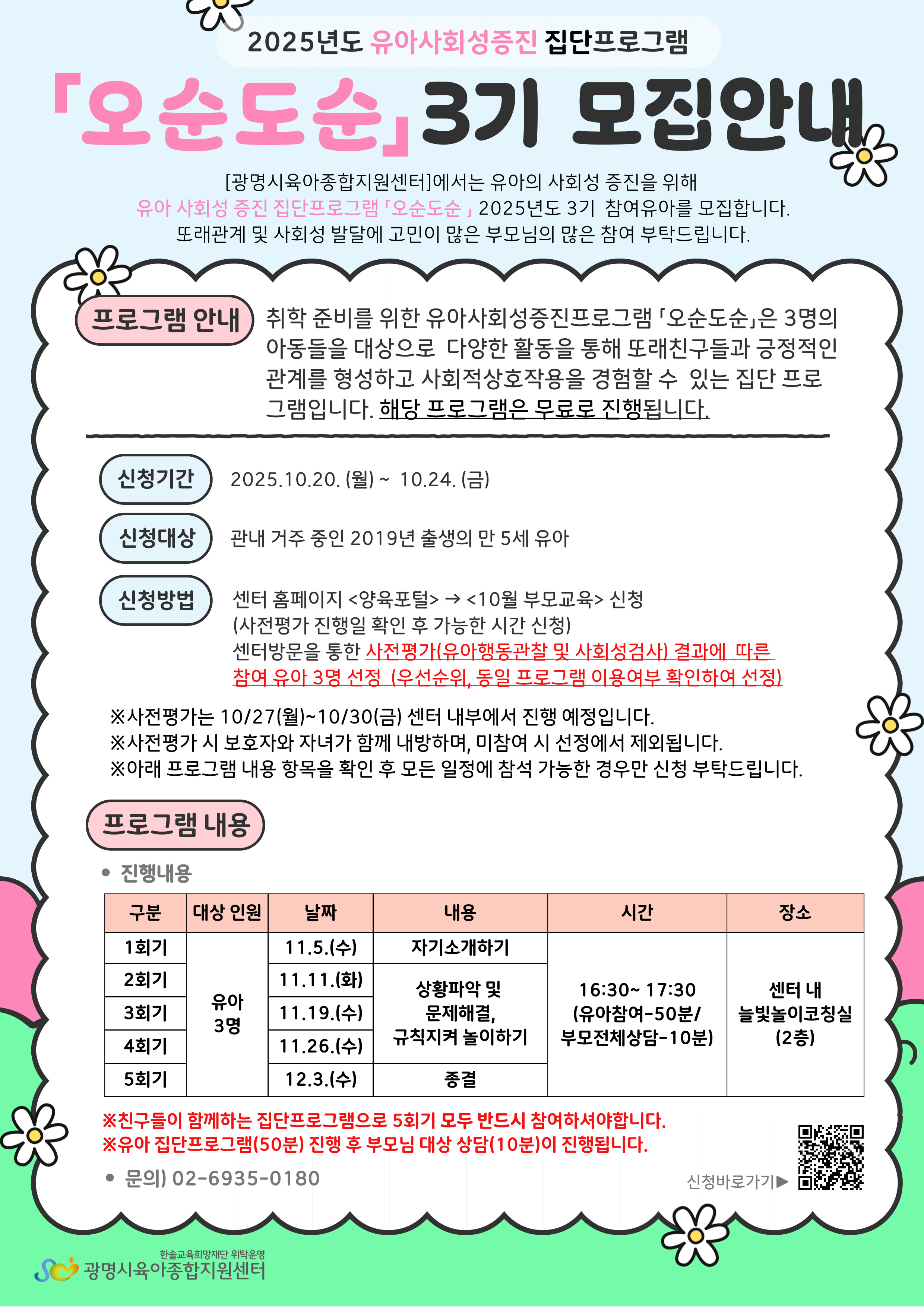 [안내] ★19년생 대상★ 2025년 유아사회성 증진프로그램 [오순도순] 3기 사전평가 신청 안내
