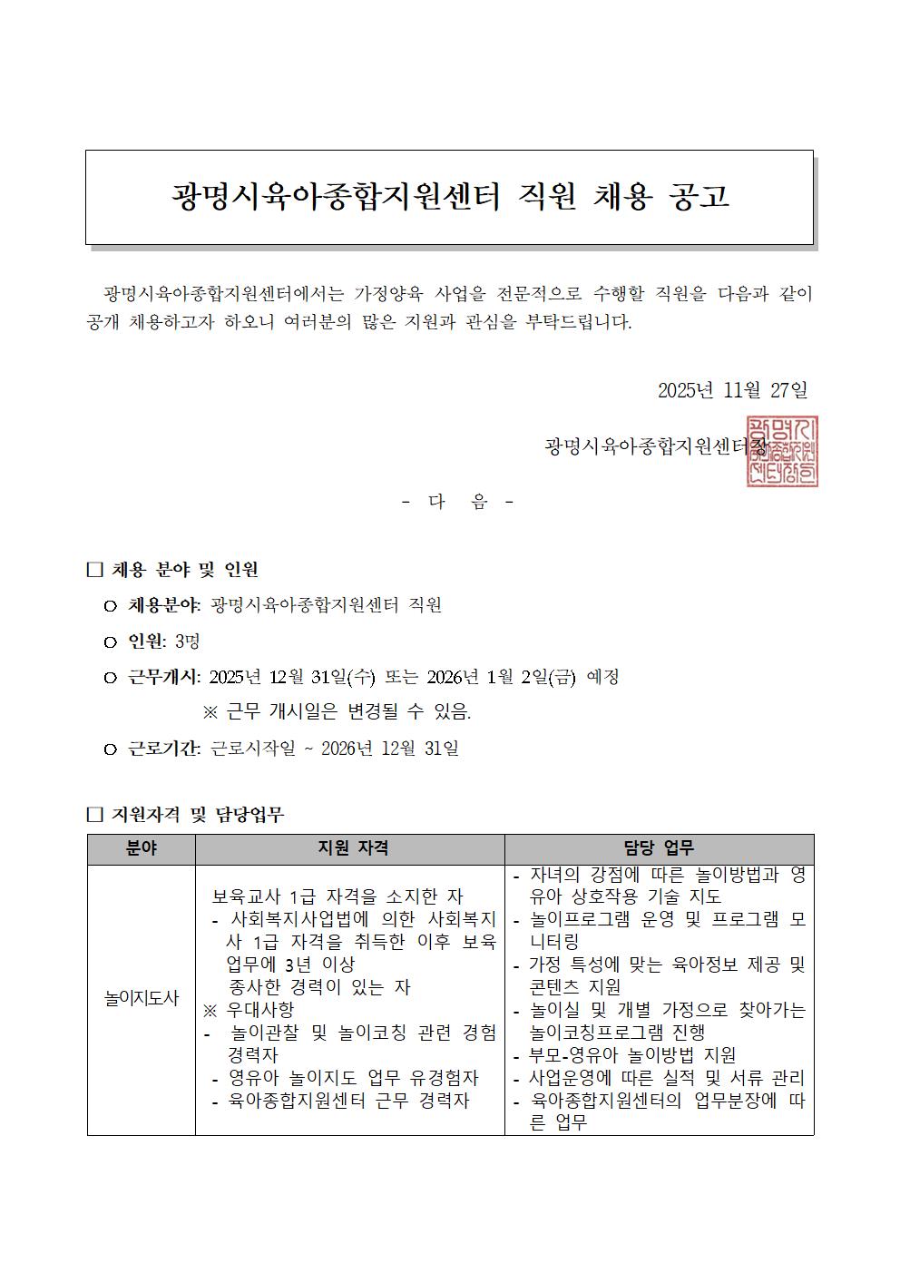 [채용] 광명시육아종합지원센터 직원 채용공고
