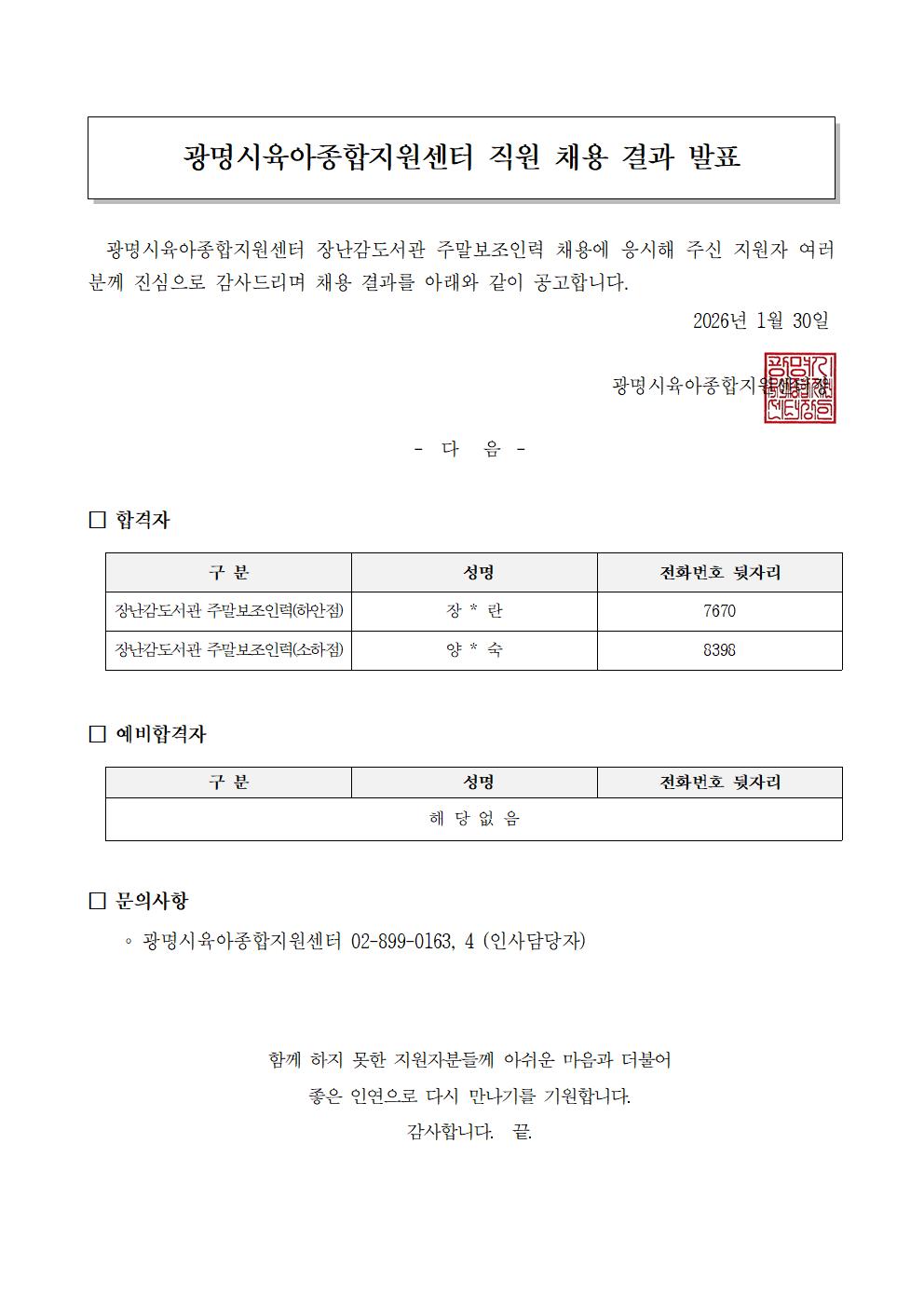 [공고] [광명시육아종합지원센터] 직원 채용결과공고