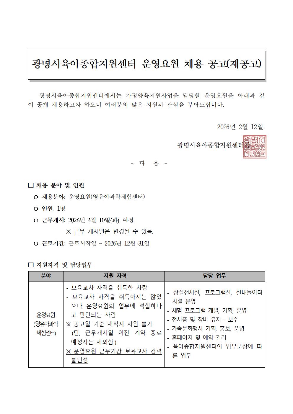 [공고] 광명시육아종합지원센터 운영요원(영유아과학체험센터) 채용공고 (재공고)
