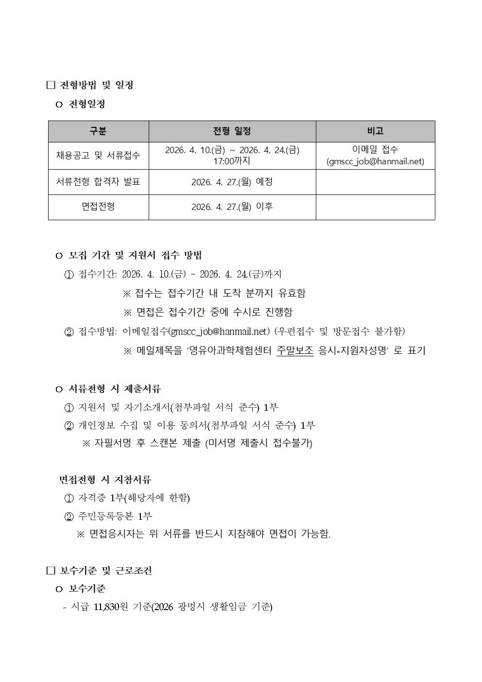 [채용] 광명시육아종합지원센터 영유아과학체험센터 주말보조인력 채용 공고