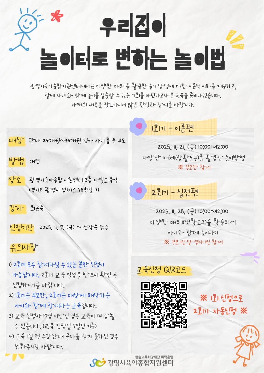 [2회기]우리 집이 놀이터로 변하는 놀이법(24개월~36개월 영아 자녀를 둔 부모 대상) 2025.11.21(금) 10:00 ~ 12:00