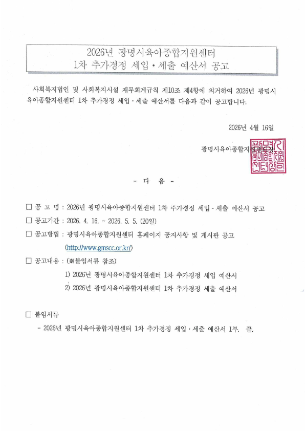 [공고] 2026년 광명시육아종합지원센터 1차 추가경정 세입세출 예산서 공고