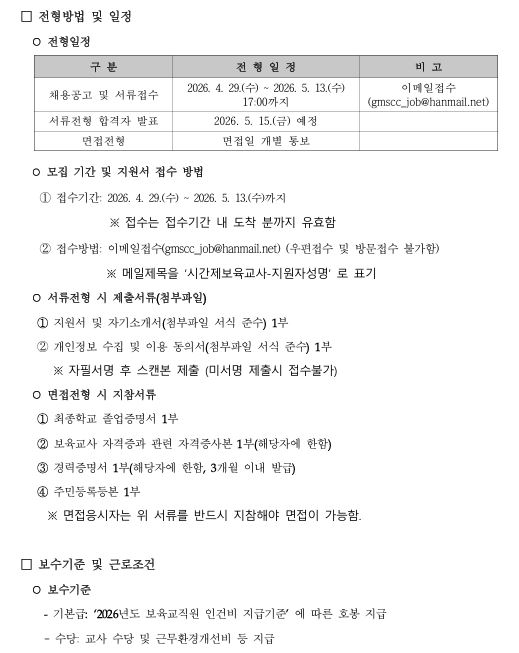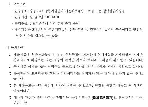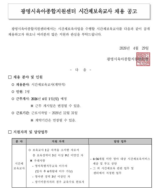 [채용] 광명시육아종합지원센터 시간제보육교사 채용 공고