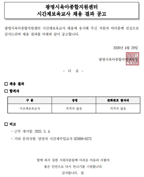 [채용] 광명시육아종합지원센터 시간제보육교사 채용 결과 공고