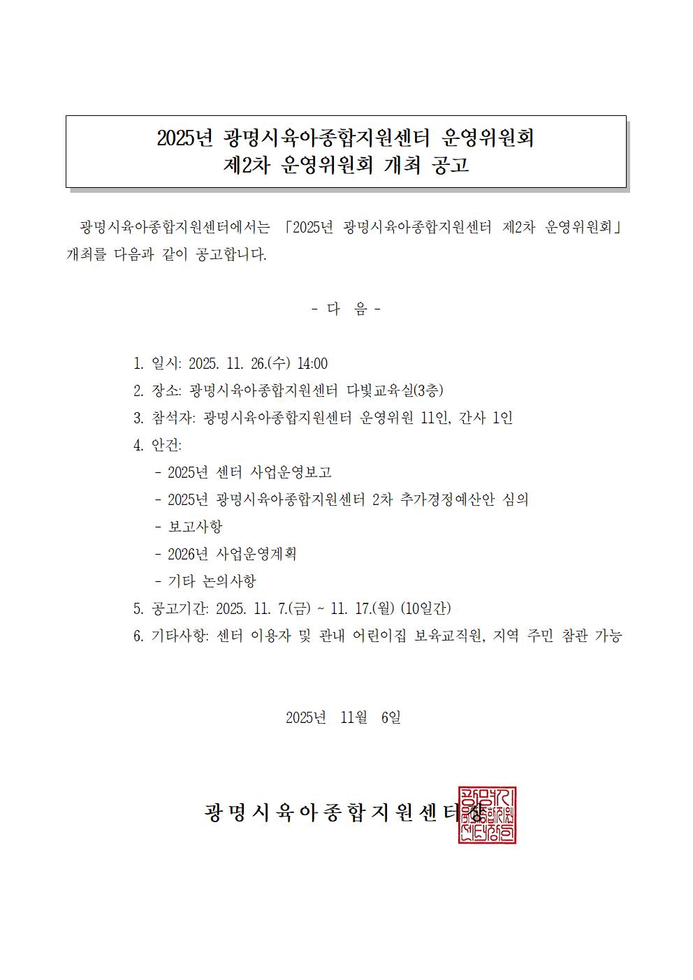 [안내] 2025년 광명시육아종합지원센터 운영위원회 제2차 운영위원회 회의 개최 공고