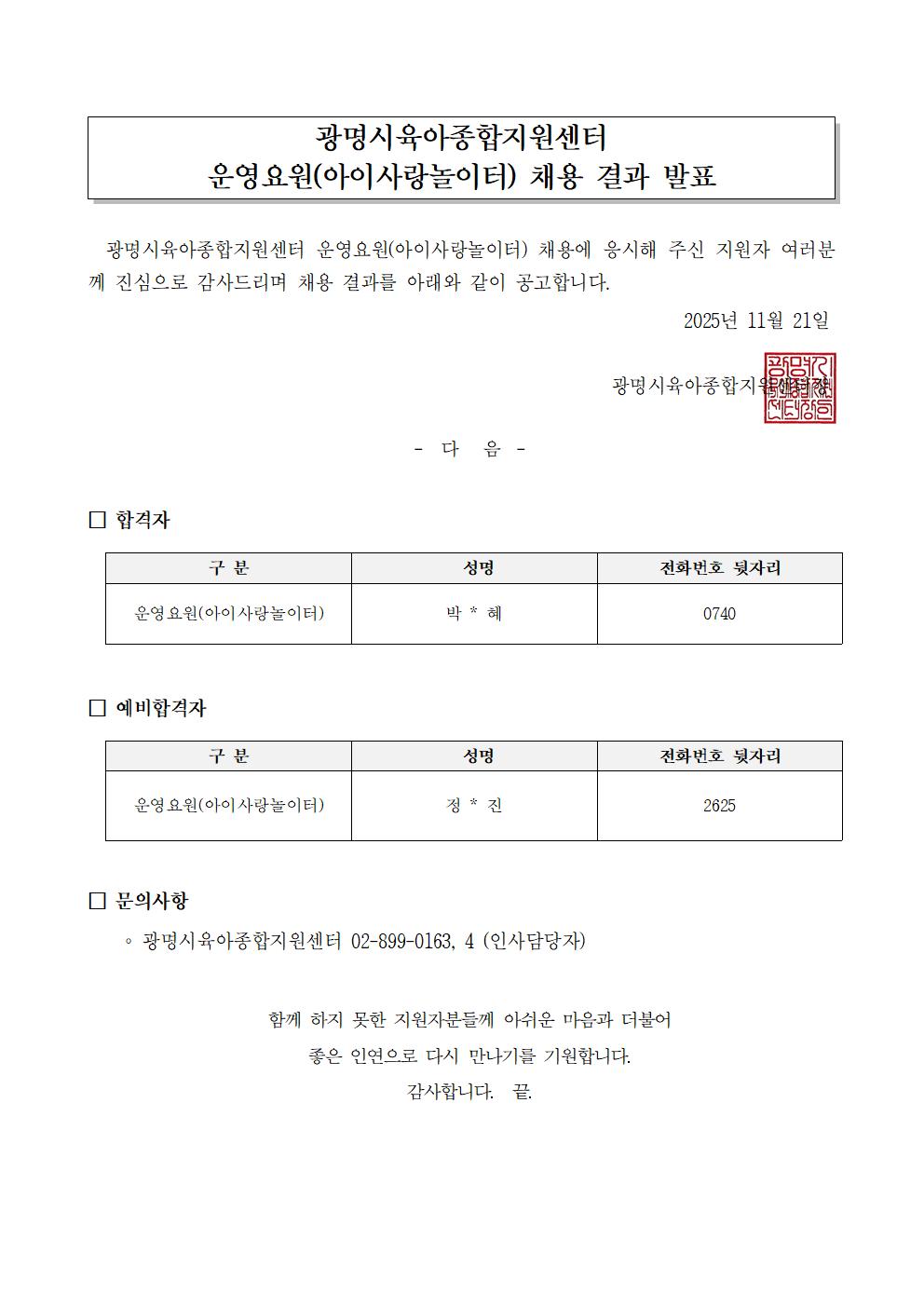 [채용] [광명시육아종합지원센터] 운영요원 채용결과공고