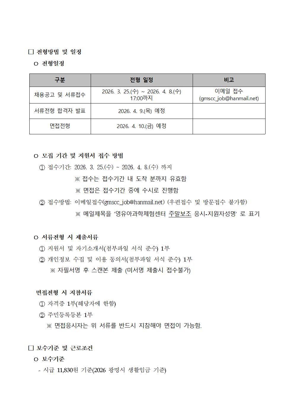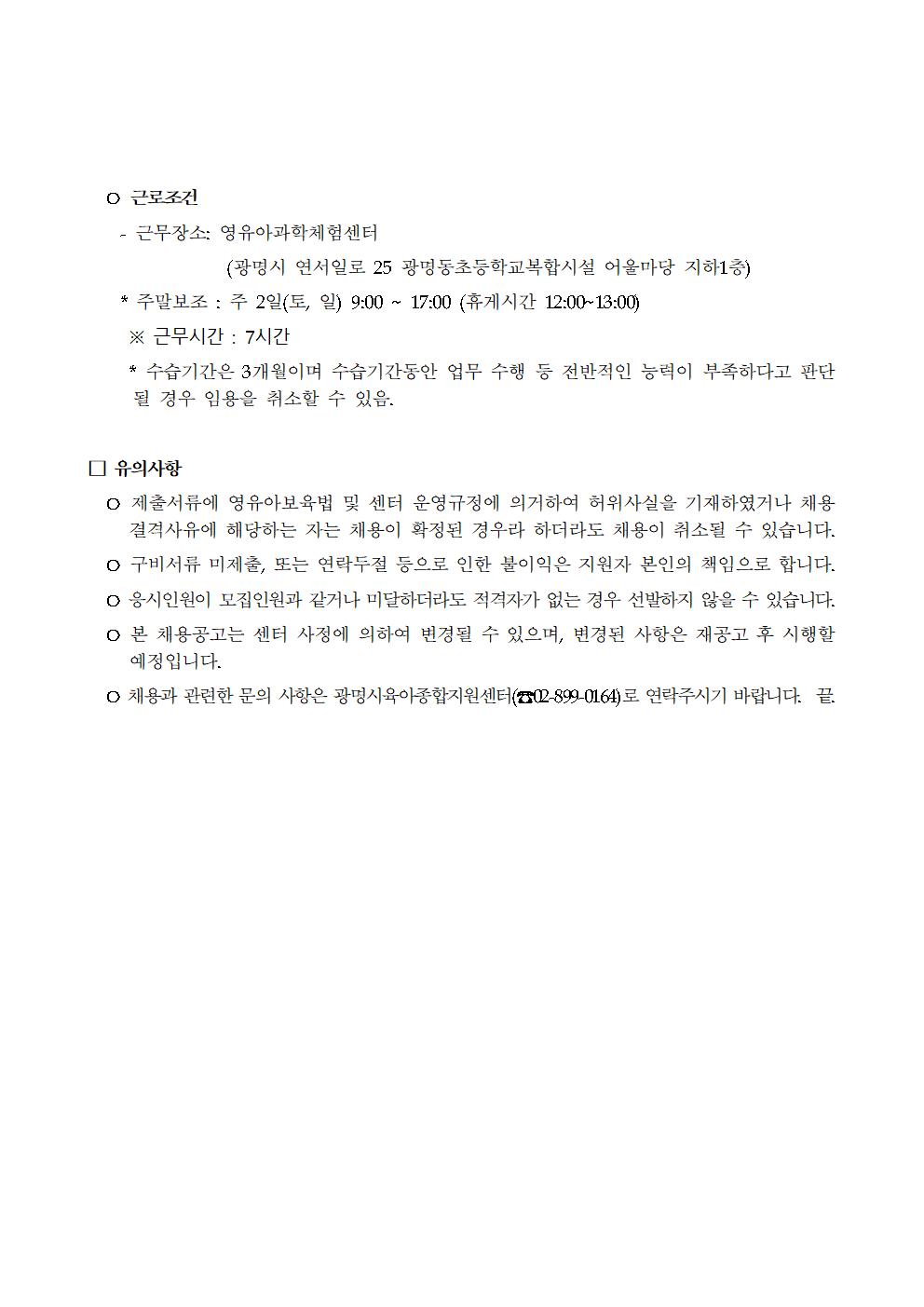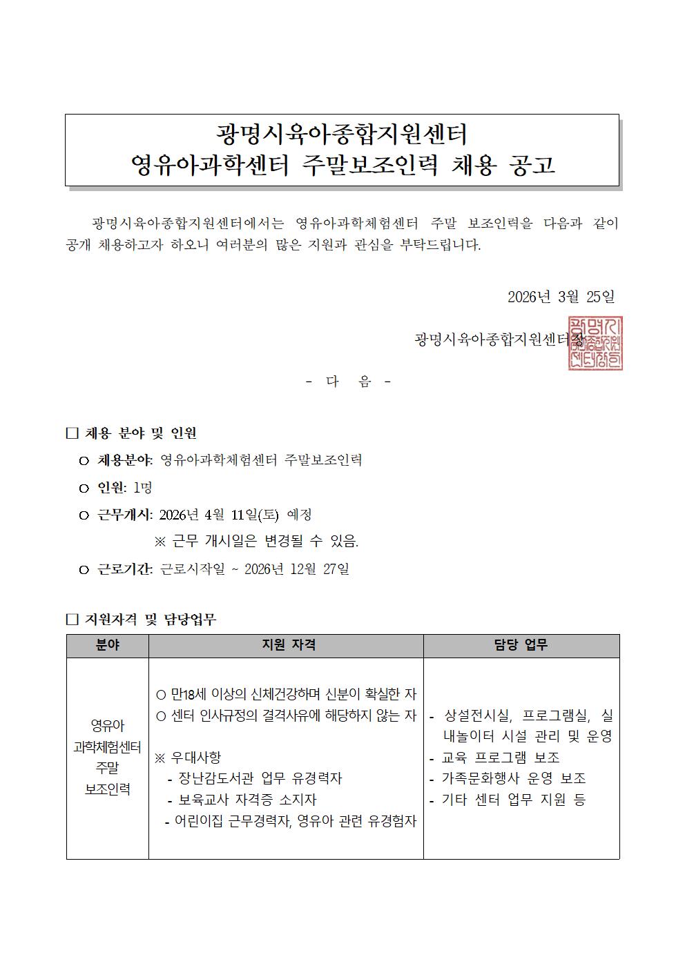 [채용] 광명시육아종합지원센터 주말보조(영유아과학체험센터) 채용공고-재공고