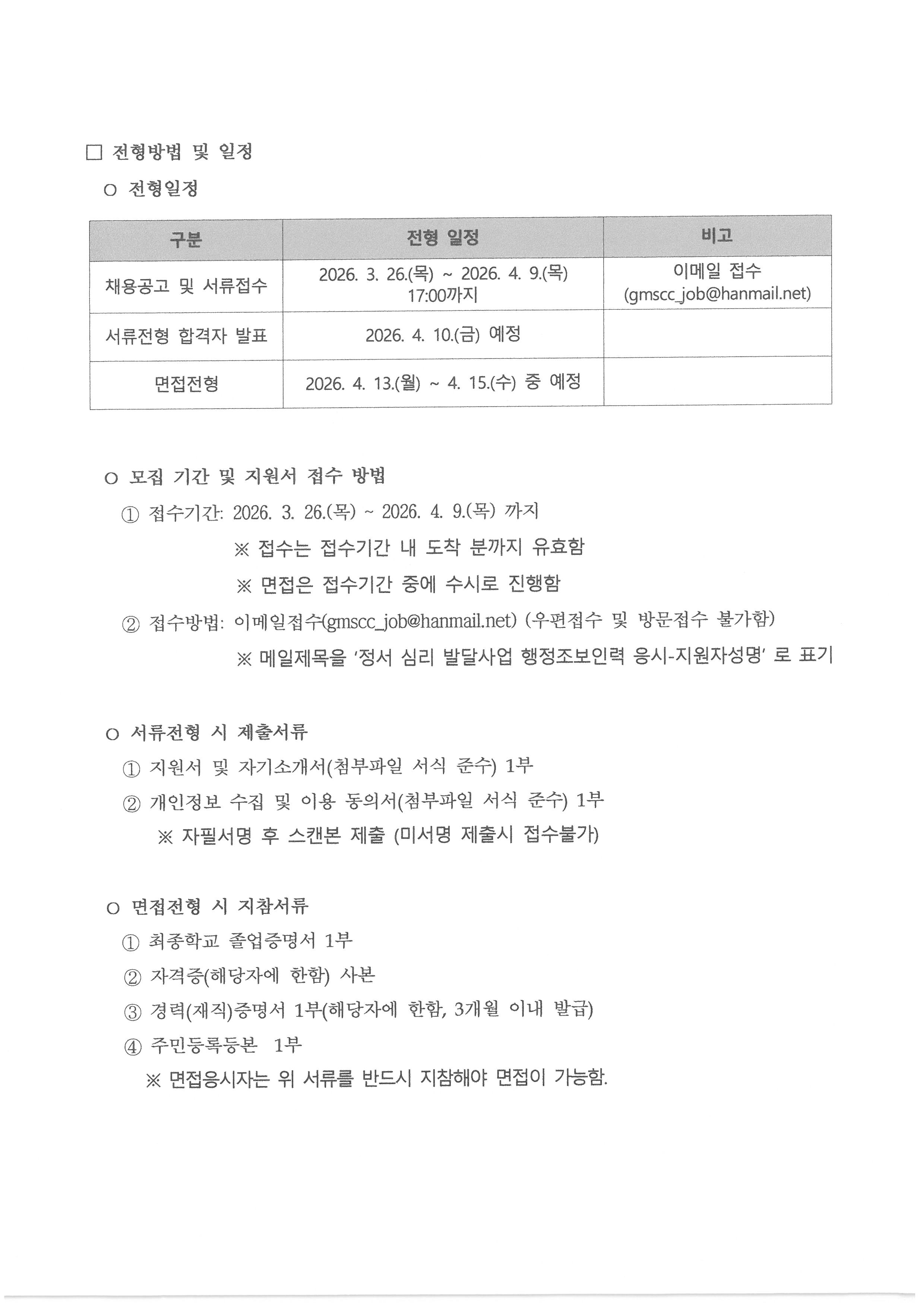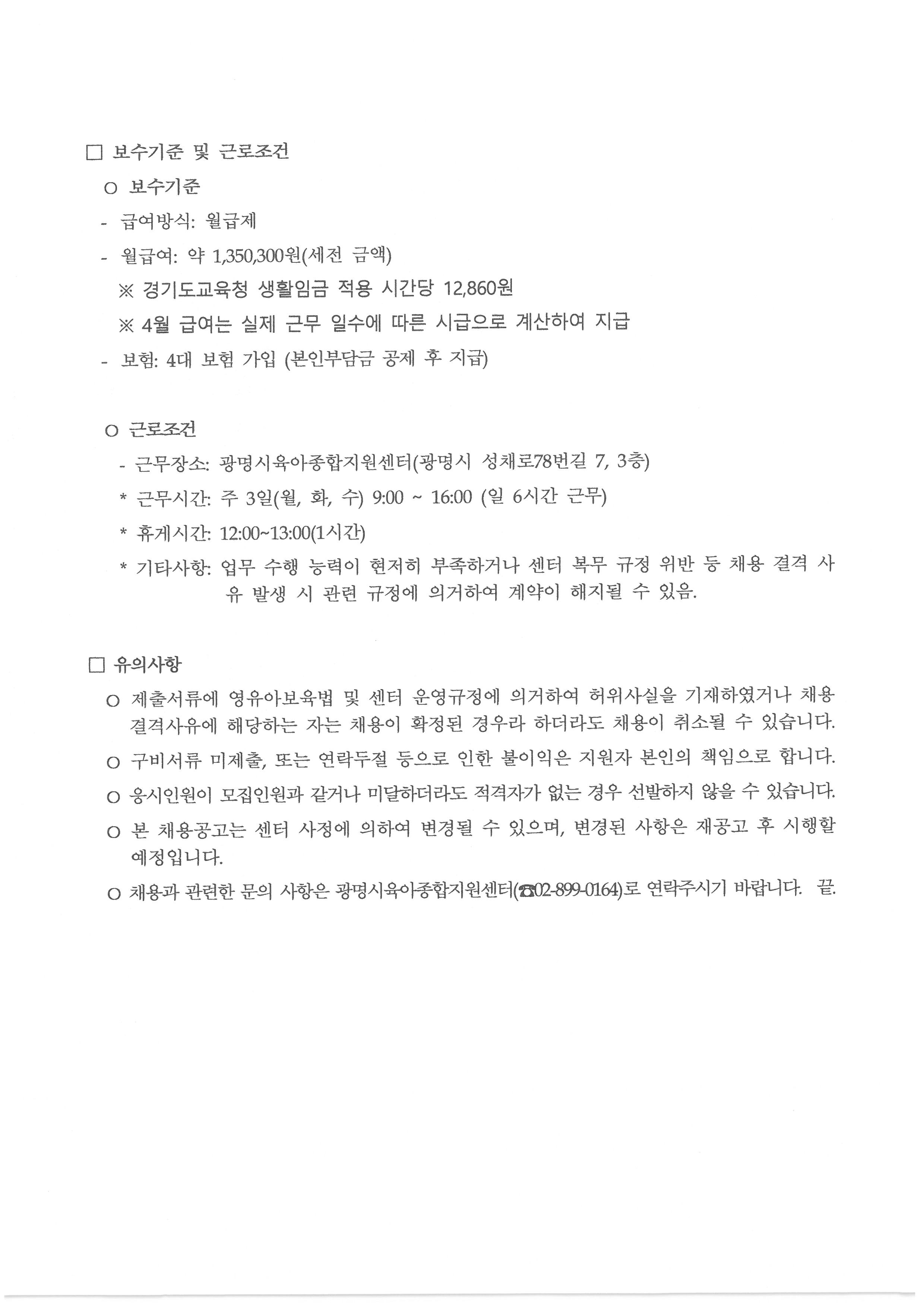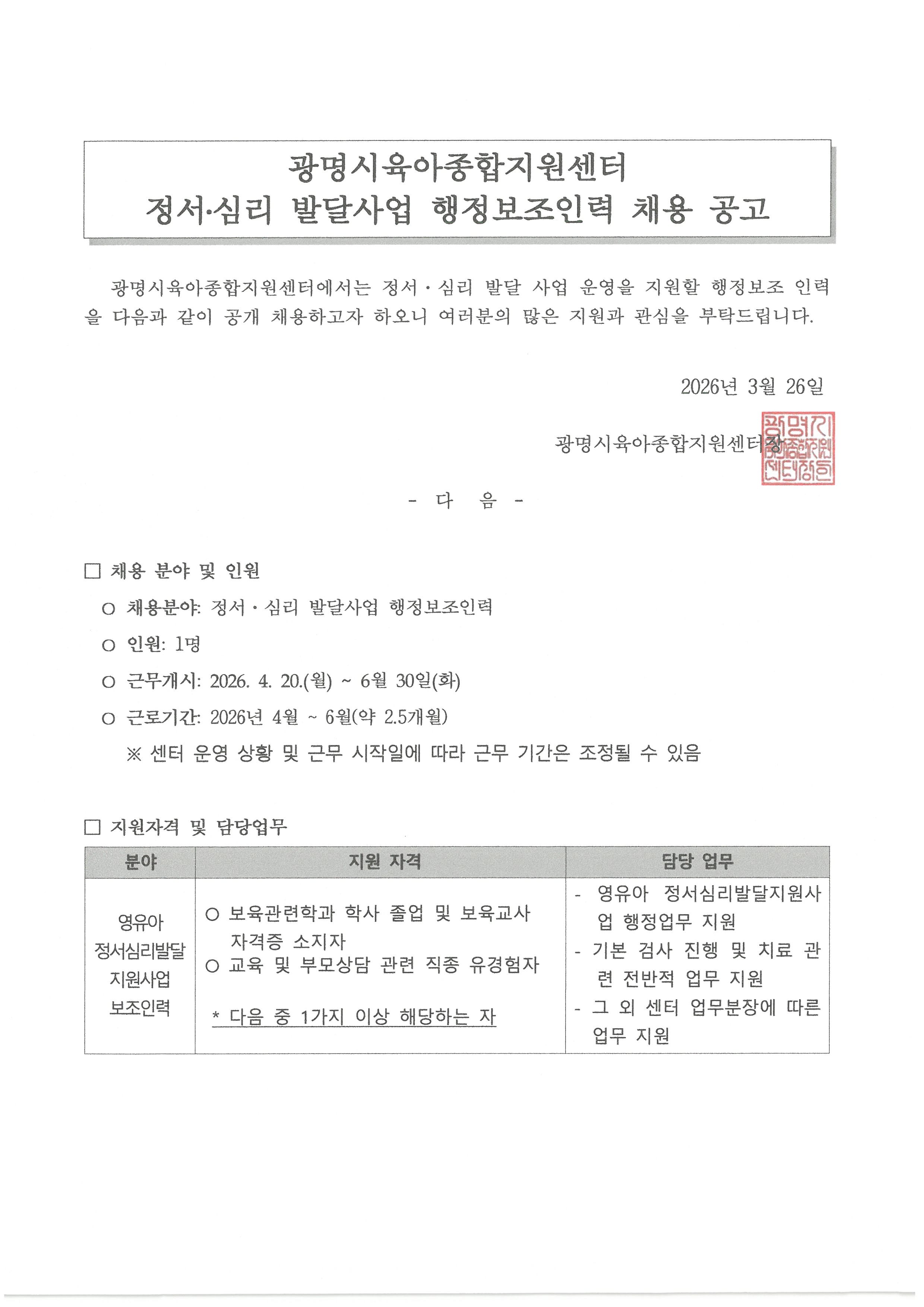 [채용] 광명시육아종합지원센터 정서 심리 발달사업 행정보조인력 채용공고