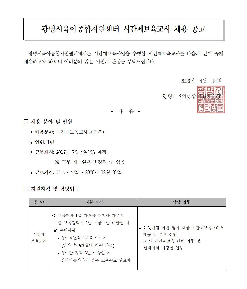 [채용] 광명시육아종합지원센터 시간제보육교사 공개 채용 공고